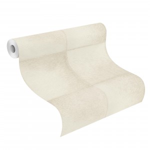 Tapeta prezentuje efektowny wzór przypominający naturalną skórę ułożoną w kwadratowe segmenty, tworząc delikatny patchwork. Beżowe, ciepłe odcienie oraz subtelna tekstura imitująca miękkość i strukturę futra lub skóry dodają wnętrzu wyjątkowej przytulności i klasy.