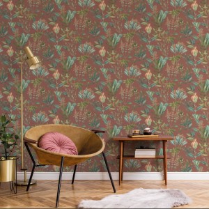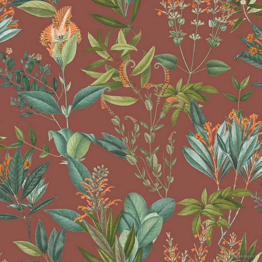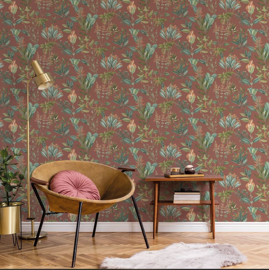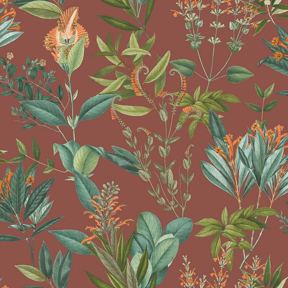 Tapeta zachwyca głębokim, rdzawym odcieniem tła, który doskonale komponuje się z detalami w kolorze butelkowej zieleni, oliwkowego brązu oraz ciepłych, pomarańczowych akcentów. To idealne połączenie barw dla osób ceniących wyrafinowane i naturalne aranżacje.