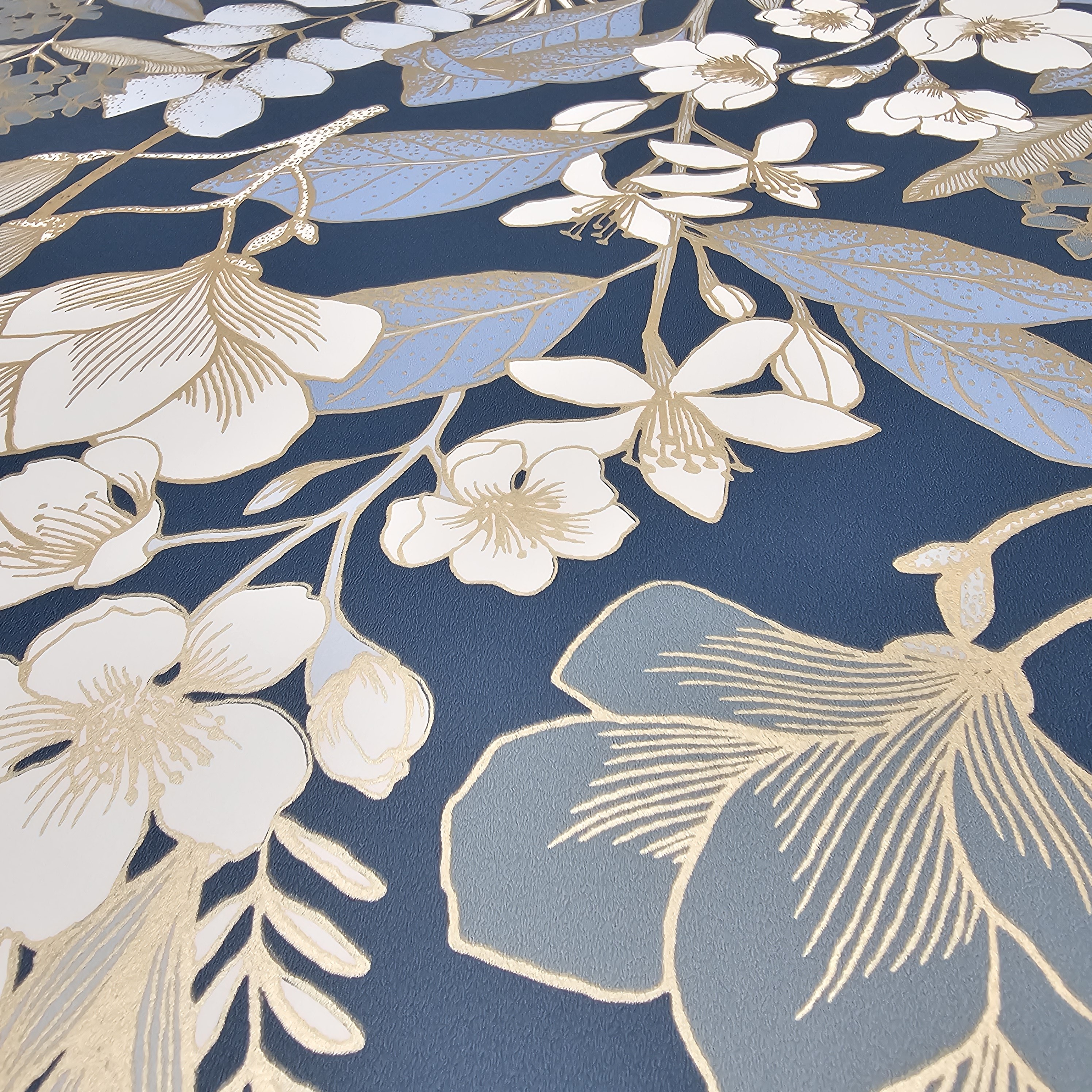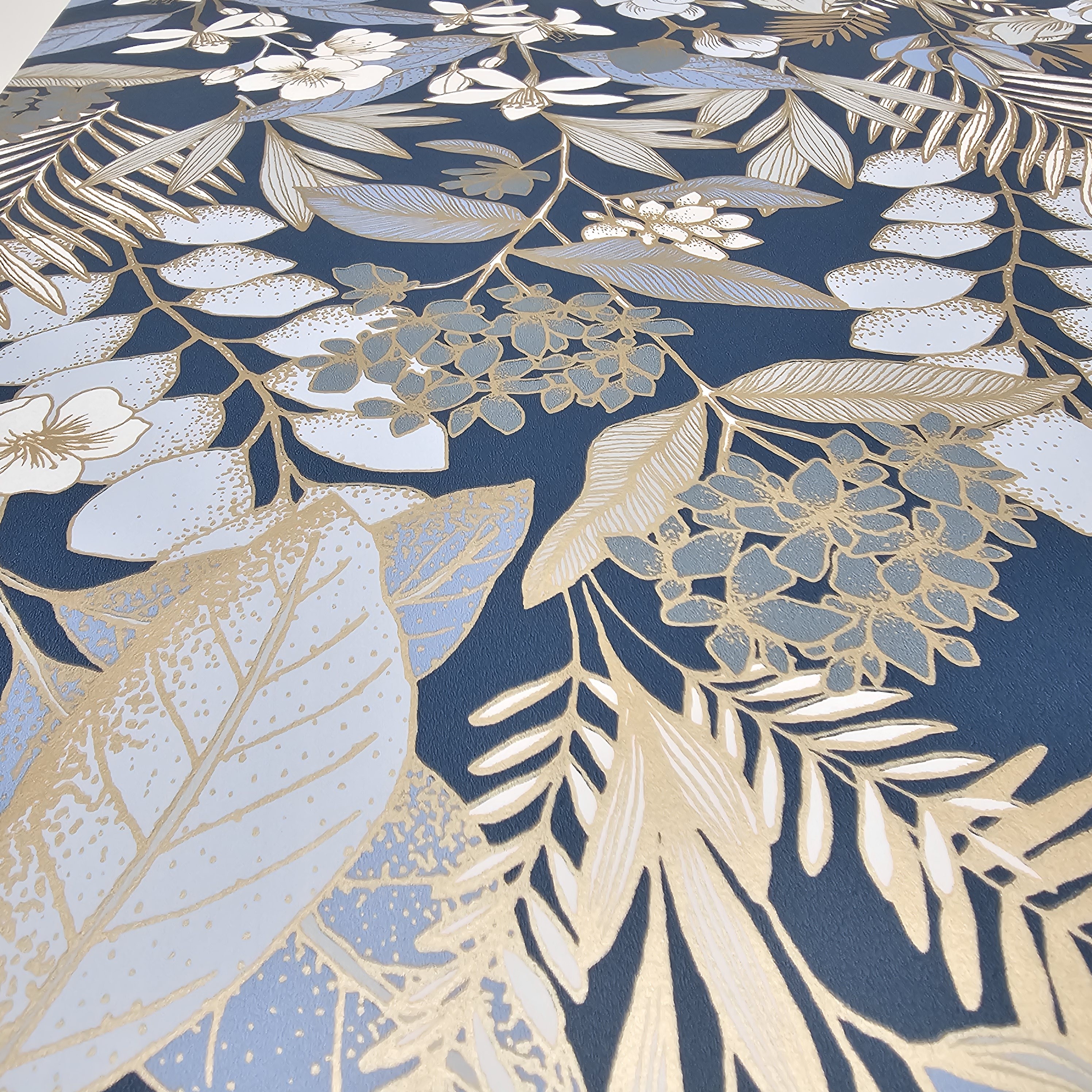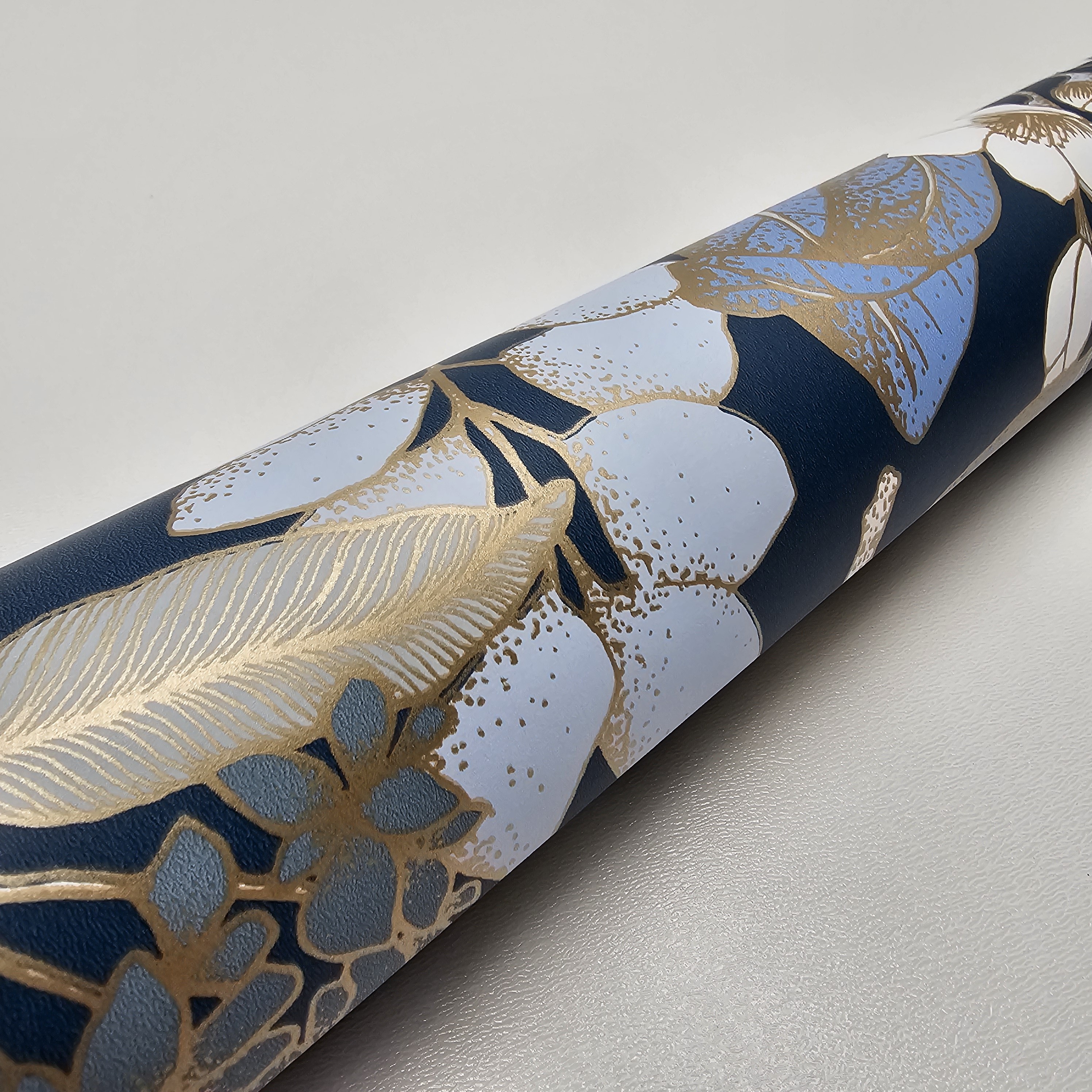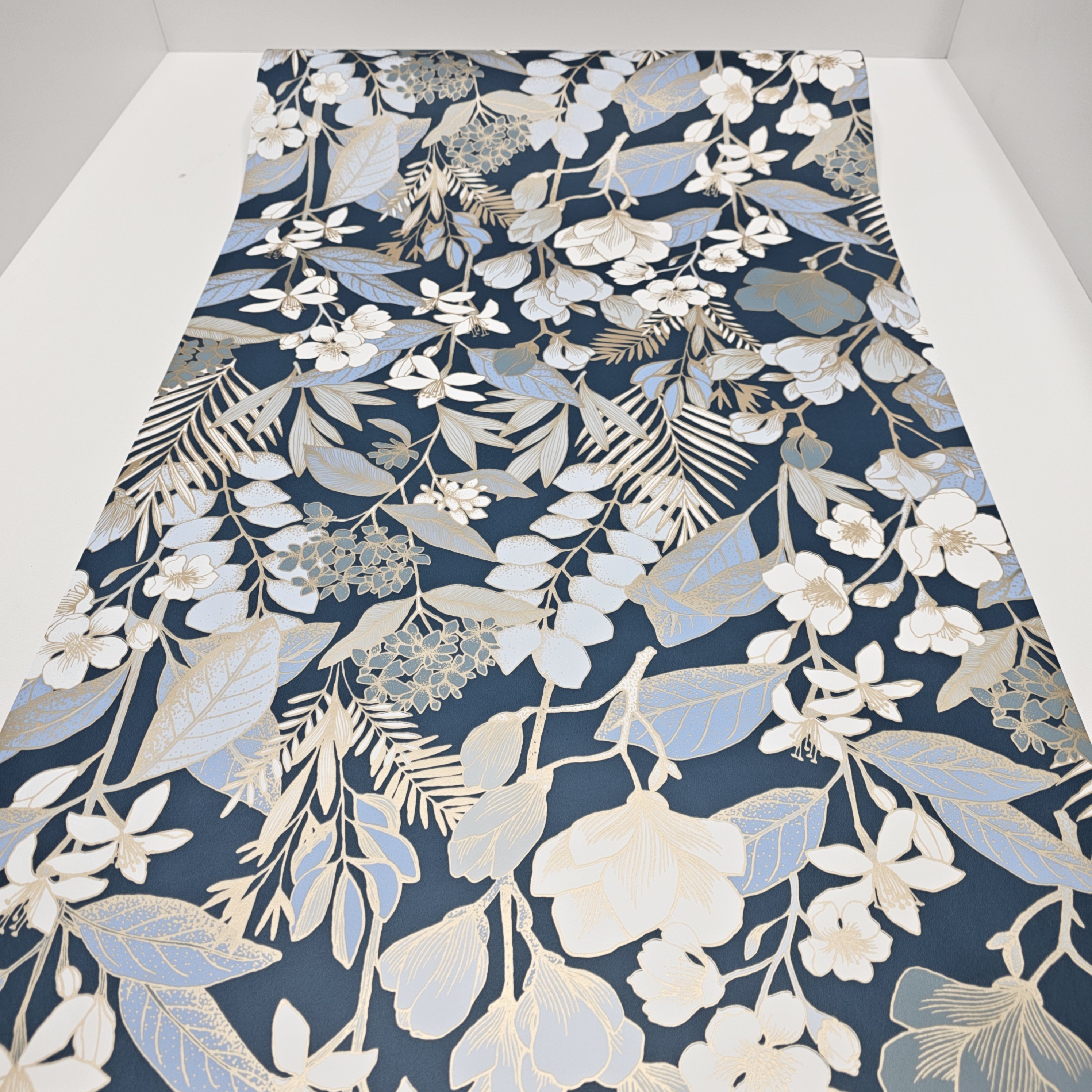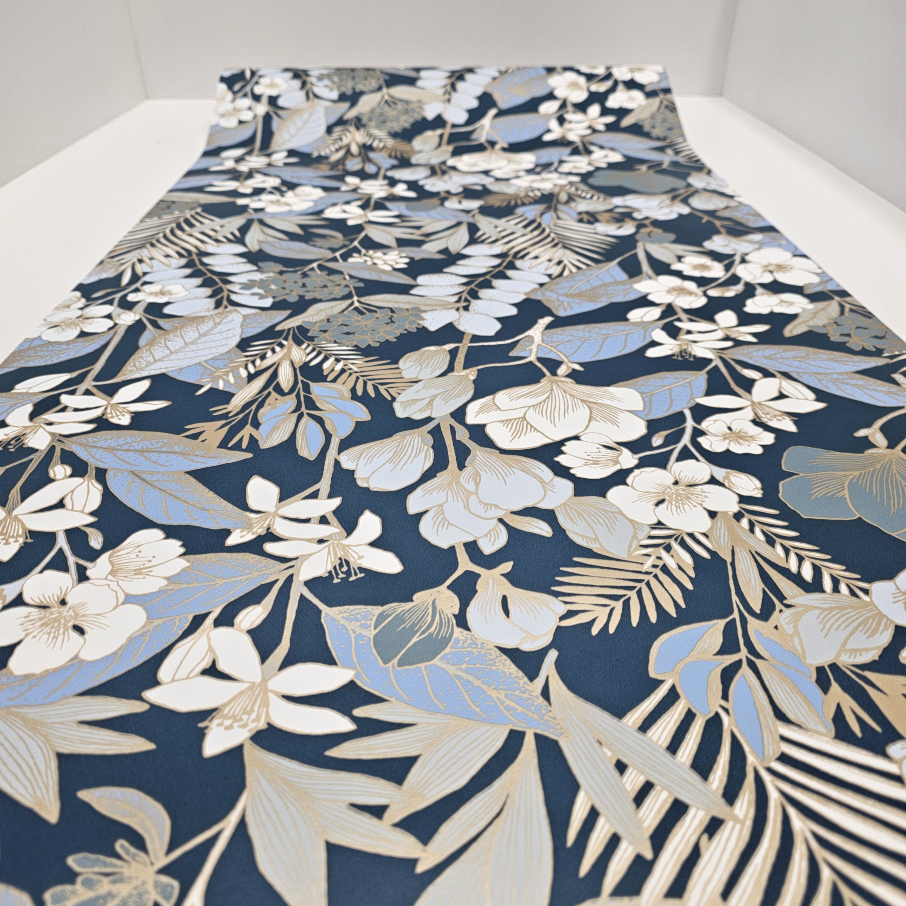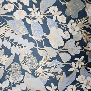 Wprowadź do swojego domu nutę elegancji i natury dzięki tapecie "Złoty Ogród". Wyjątkowy wzór przedstawia delikatne, złociste gałązki, kwiaty i liście na głębokim, ciemnoniebieskim tle. Połączenie matowego tła z subtelnym połyskiem złotych detali nadaje tapecie luksusowy charakter.