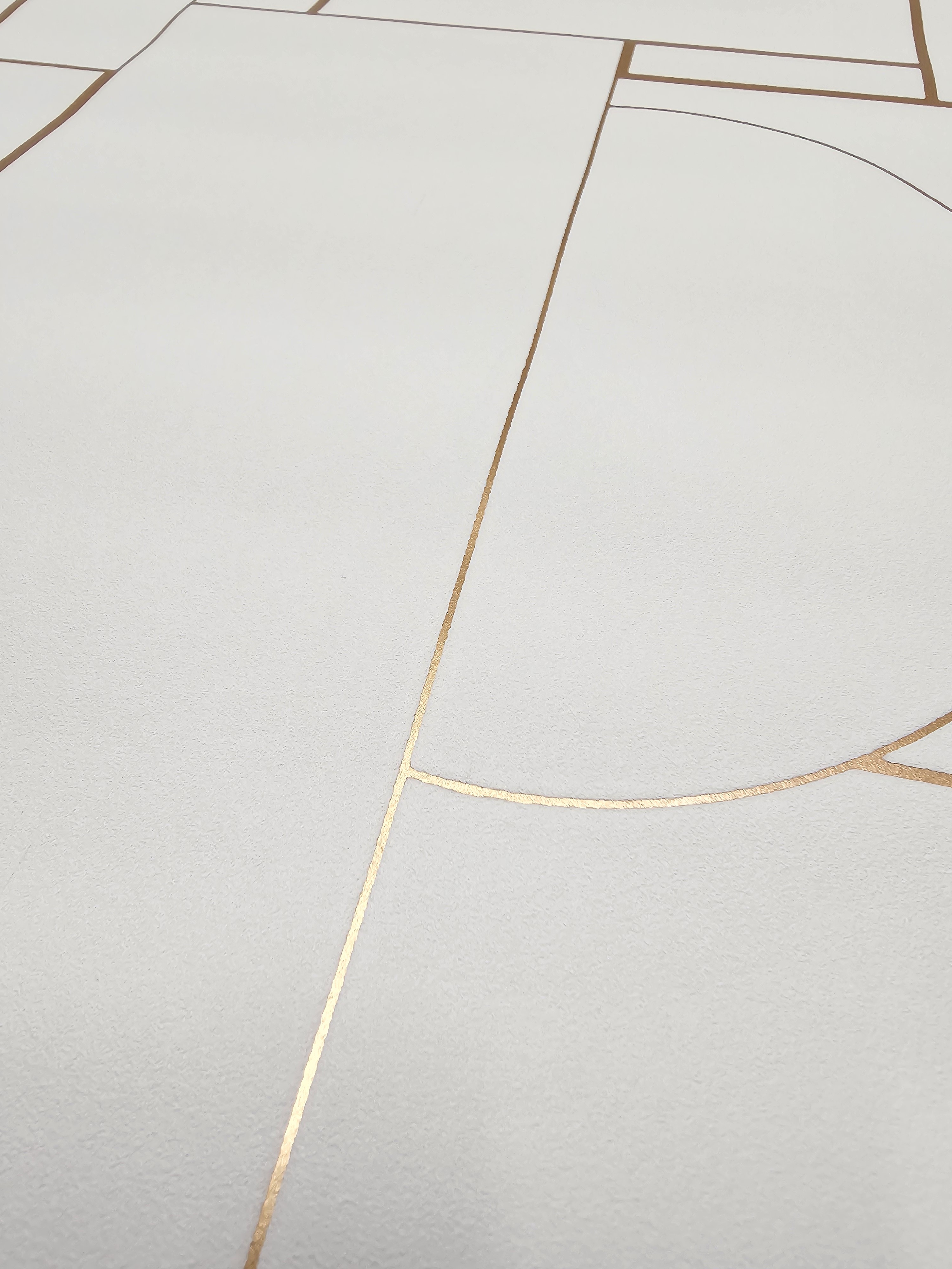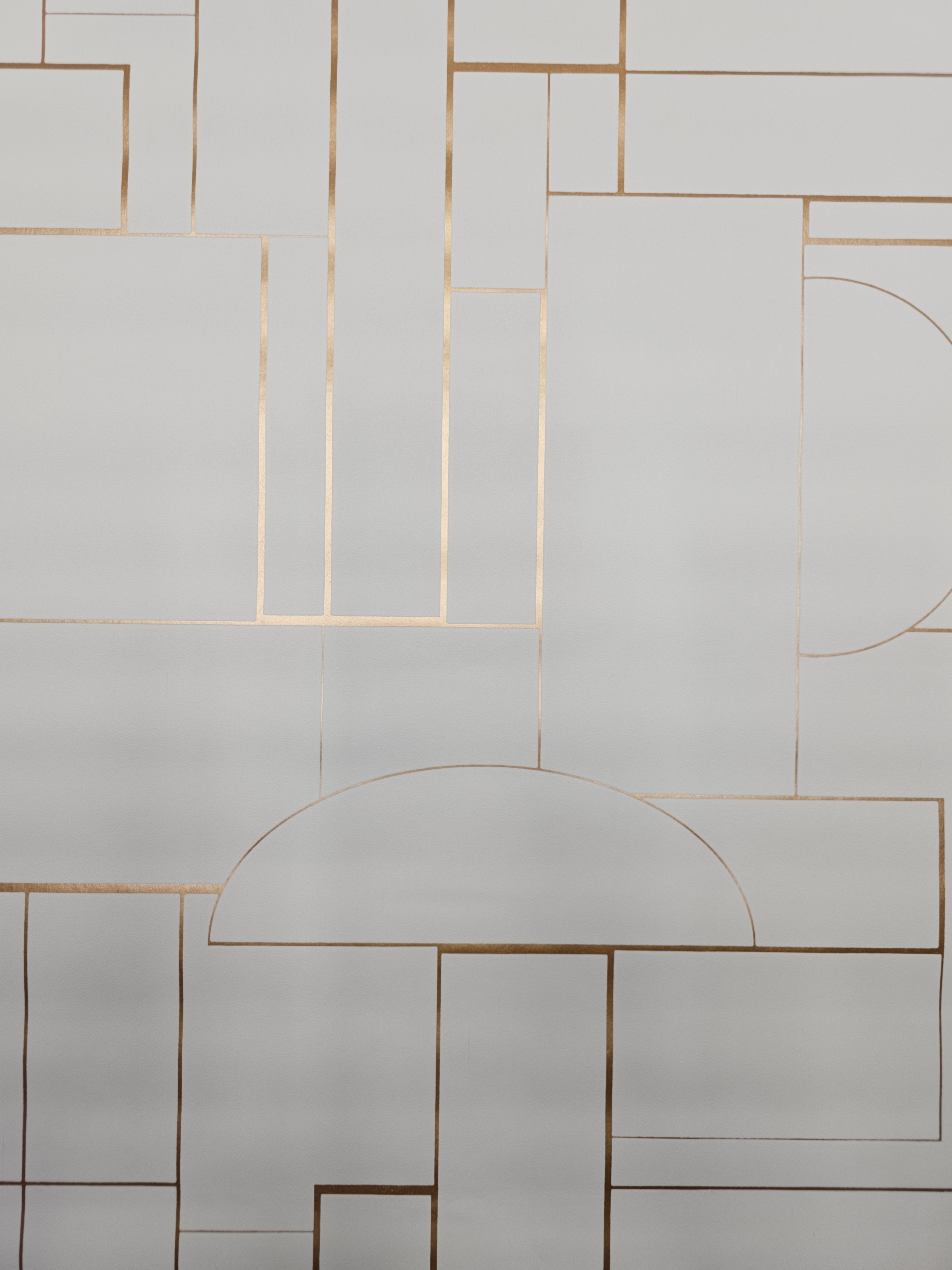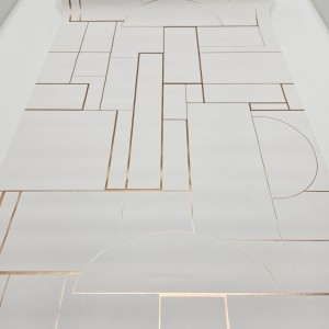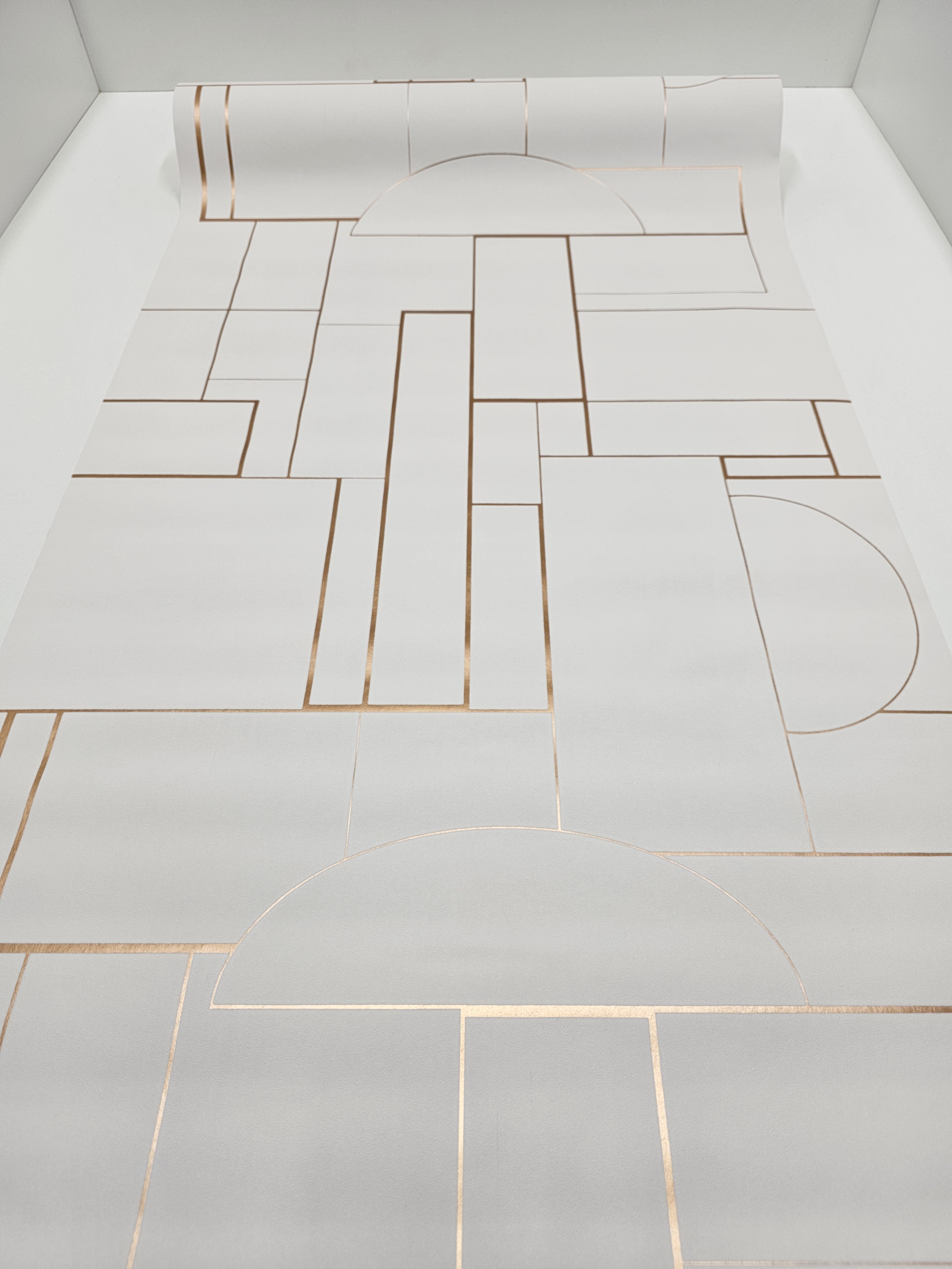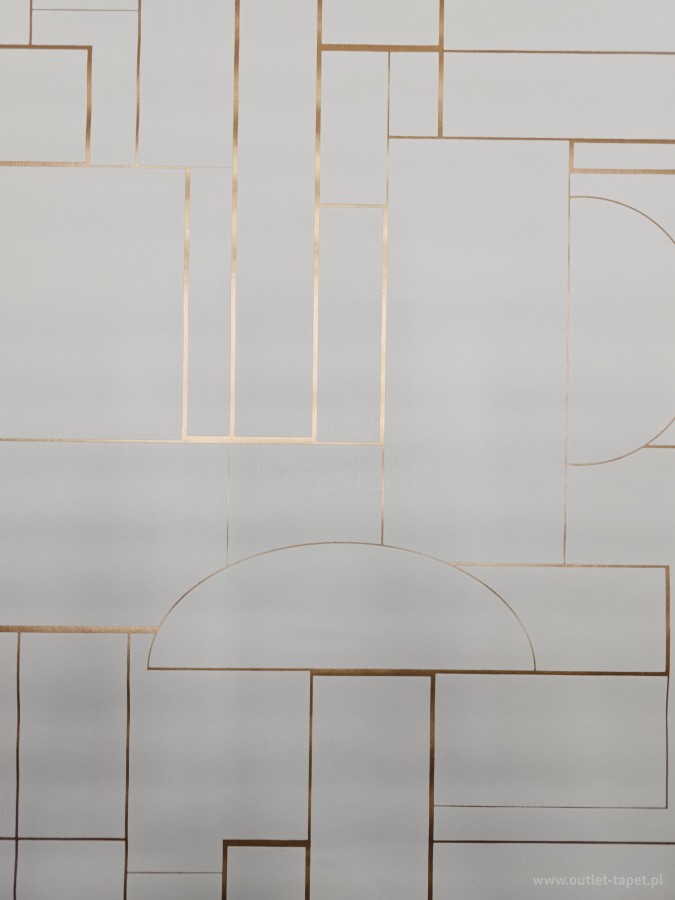 Ta designerska tapeta przyciąga wzrok nowoczesnym, geometrycznym wzorem, który łączy prostokąty, kwadraty oraz półkola w harmonijną, abstrakcyjną kompozycję. Całość utrzymana jest w eleganckim odcieniu jasnej szarości lub przygaszonej bieli, natomiast linie podziału wykonane zostały w połyskującym, metalicznym odcieniu miedzi lub złota różowego, co nadaje tapecie luksusowy, dekoracyjny charakter.