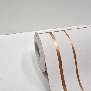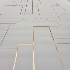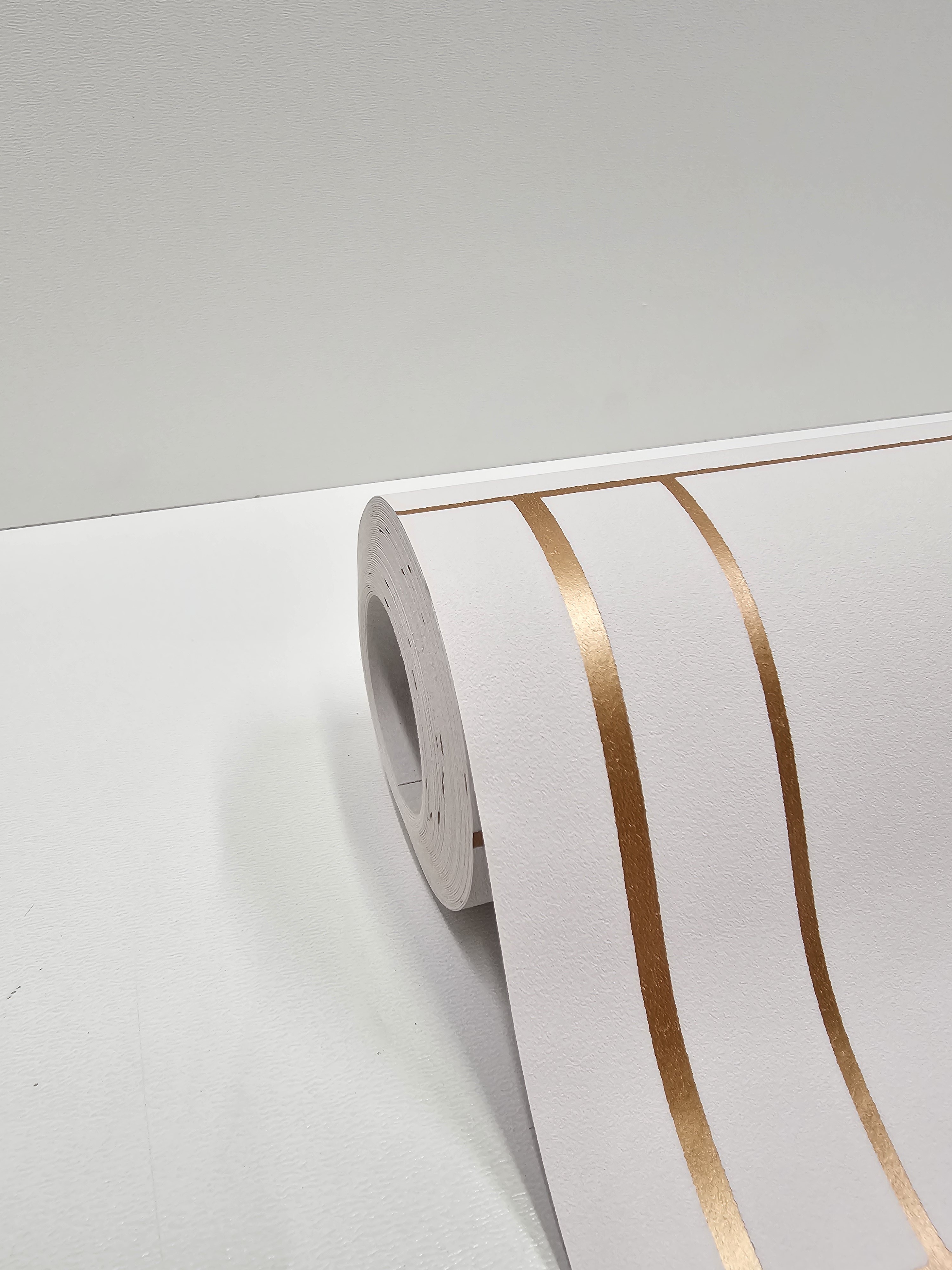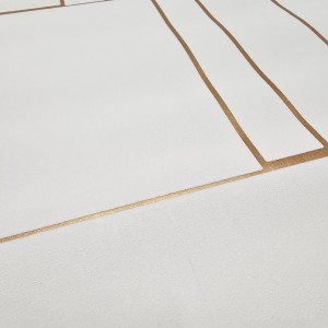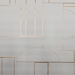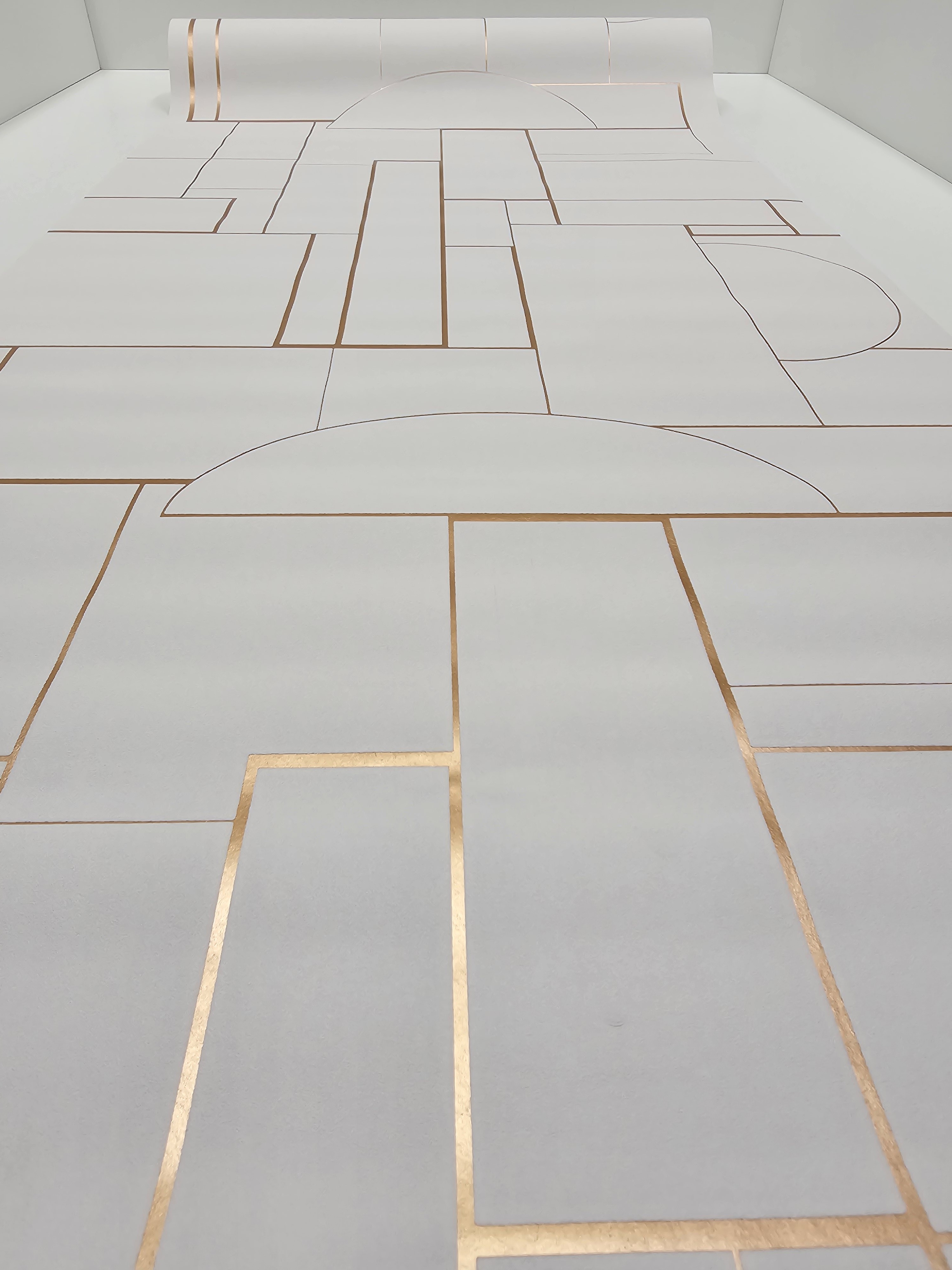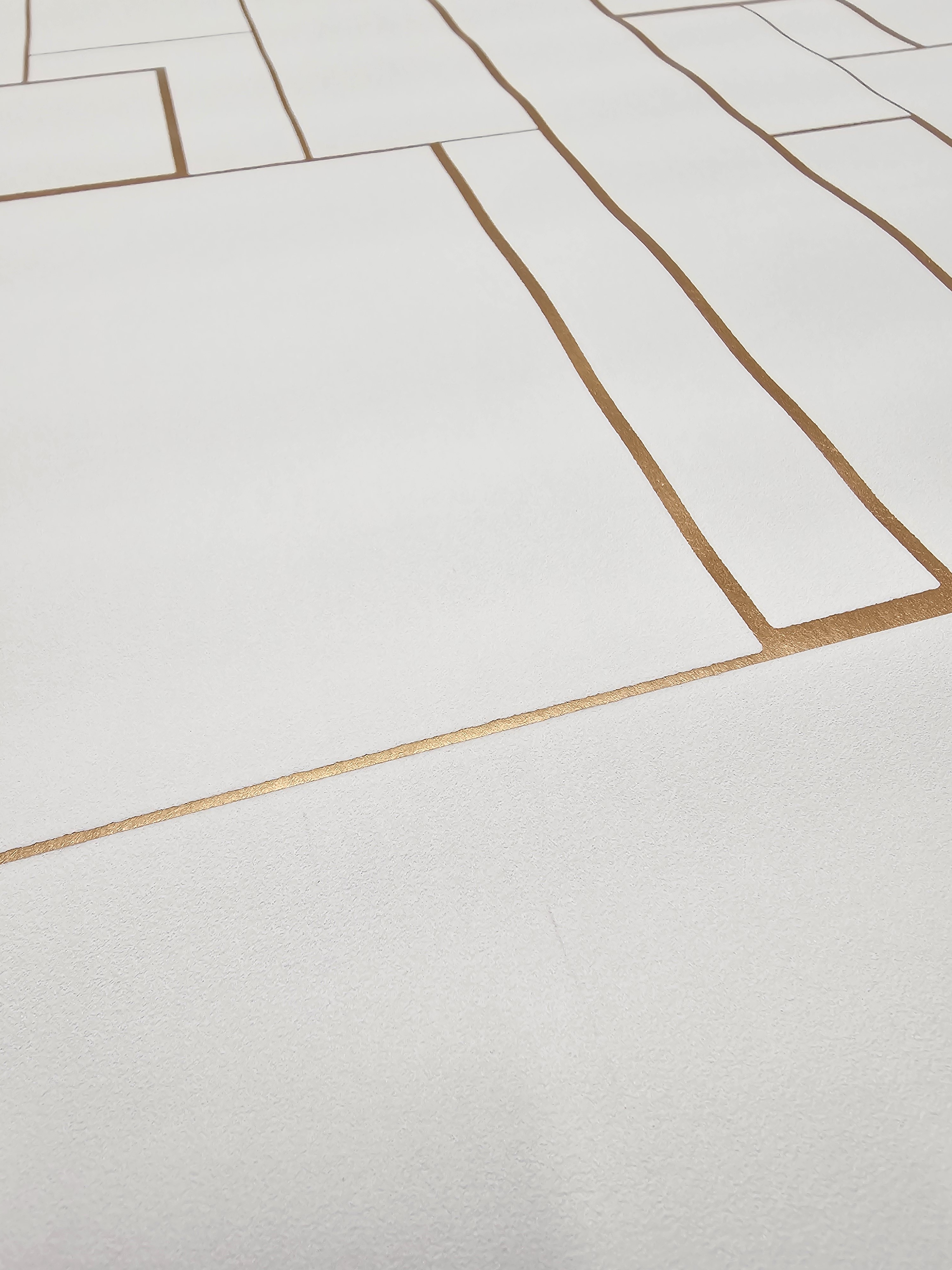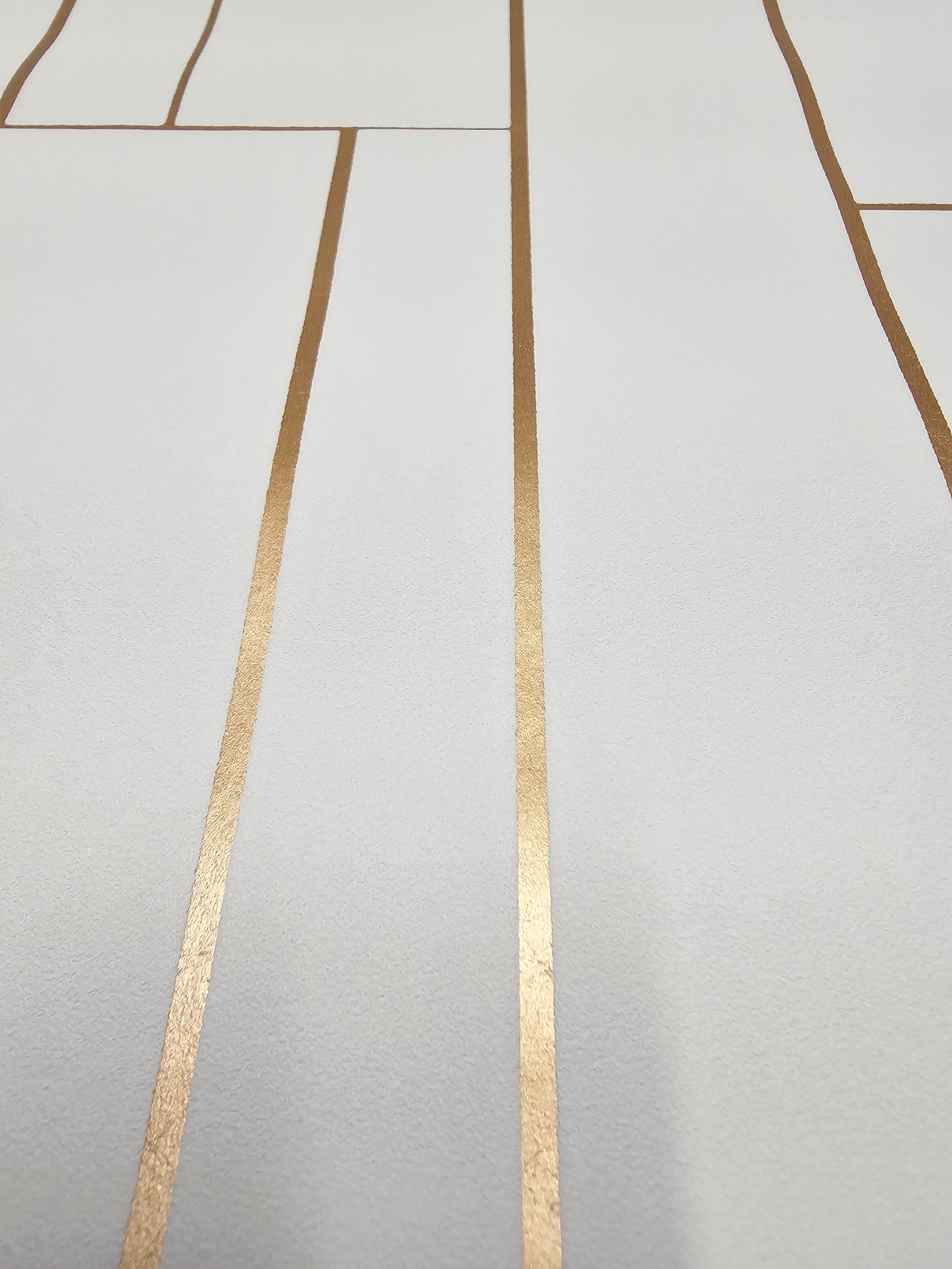Ta designerska tapeta przyciąga wzrok nowoczesnym, geometrycznym wzorem, który łączy prostokąty, kwadraty oraz półkola w harmonijną, abstrakcyjną kompozycję. Całość utrzymana jest w eleganckim odcieniu jasnej szarości lub przygaszonej bieli, natomiast linie podziału wykonane zostały w połyskującym, metalicznym odcieniu miedzi lub złota różowego, co nadaje tapecie luksusowy, dekoracyjny charakter.