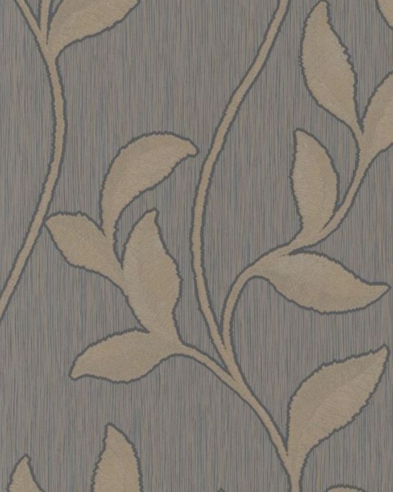 Prezentowana tapeta to doskonałe połączenie ponadczasowej estetyki z subtelną inspiracją naturą. Tło w odcieniu denimowego błękitu posiada delikatną, pionową strukturę, która przypomina efekt tkaniny. Na jego powierzchni rozpościera się roślinny wzór z liśćmi i wijącymi się gałązkami w kolorze ciepłego beżu, wykończony ciemnym konturem, który nadaje wzorowi głębi i wyrazistości.
