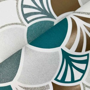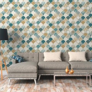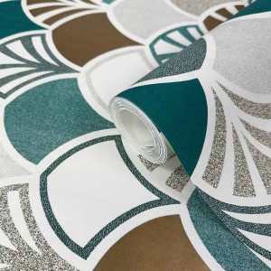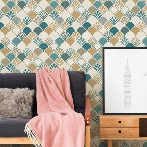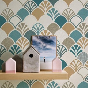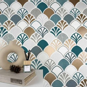 Ożyw swoje wnętrze odrobiną luksusu! Tapeta przedstawia stylizowany wzór wachlarzy w klimacie art déco, który przyciąga uwagę geometryczną precyzją i elegancką kolorystyką. Motyw przypomina rybie łuski lub wachlarze, ułożone w powtarzającym się, harmonijnym rytmie. Dzięki subtelnemu połyskowi i efektowi trójwymiarowości tapeta zyskuje wyjątkowy charakter dekoracyjny.