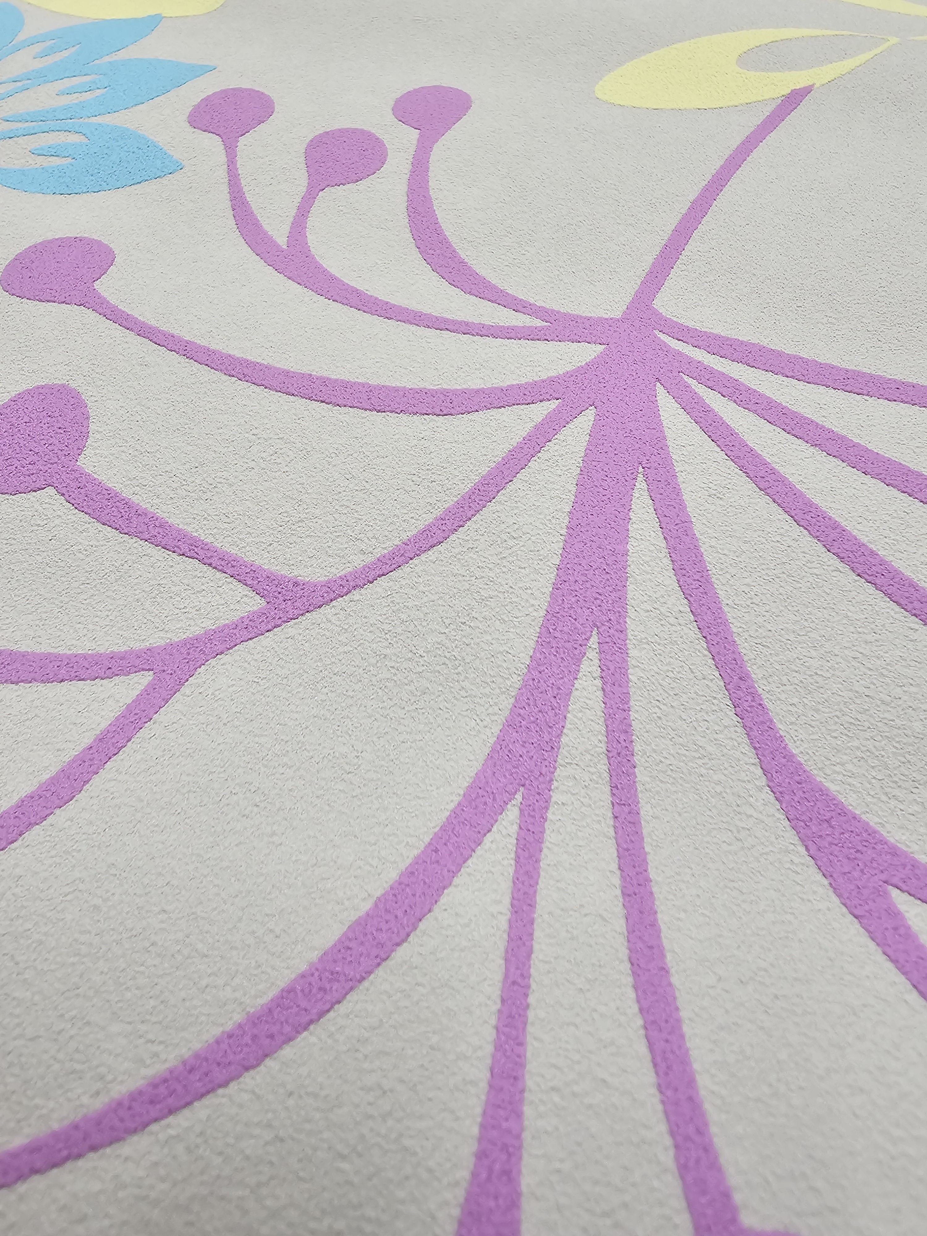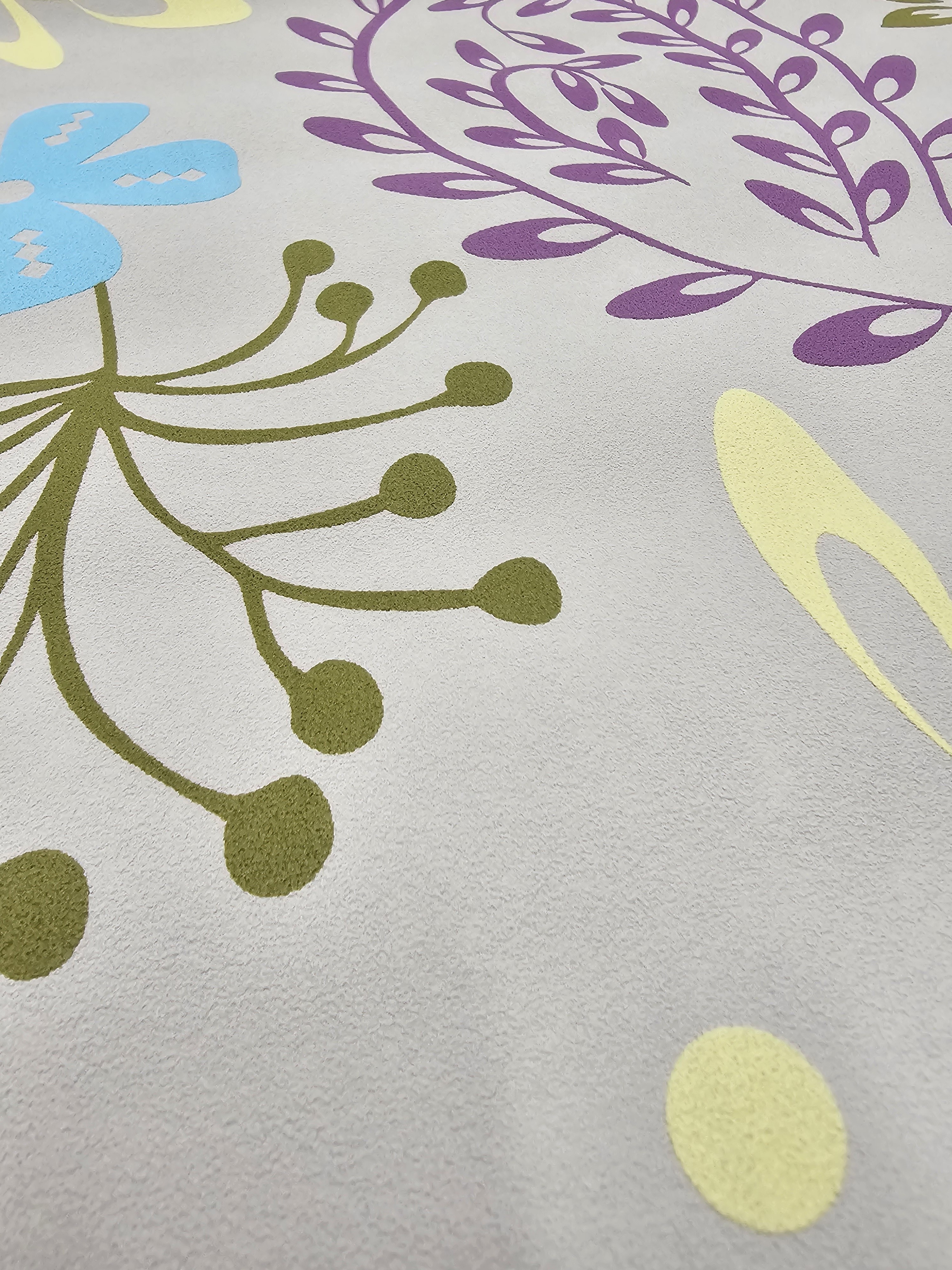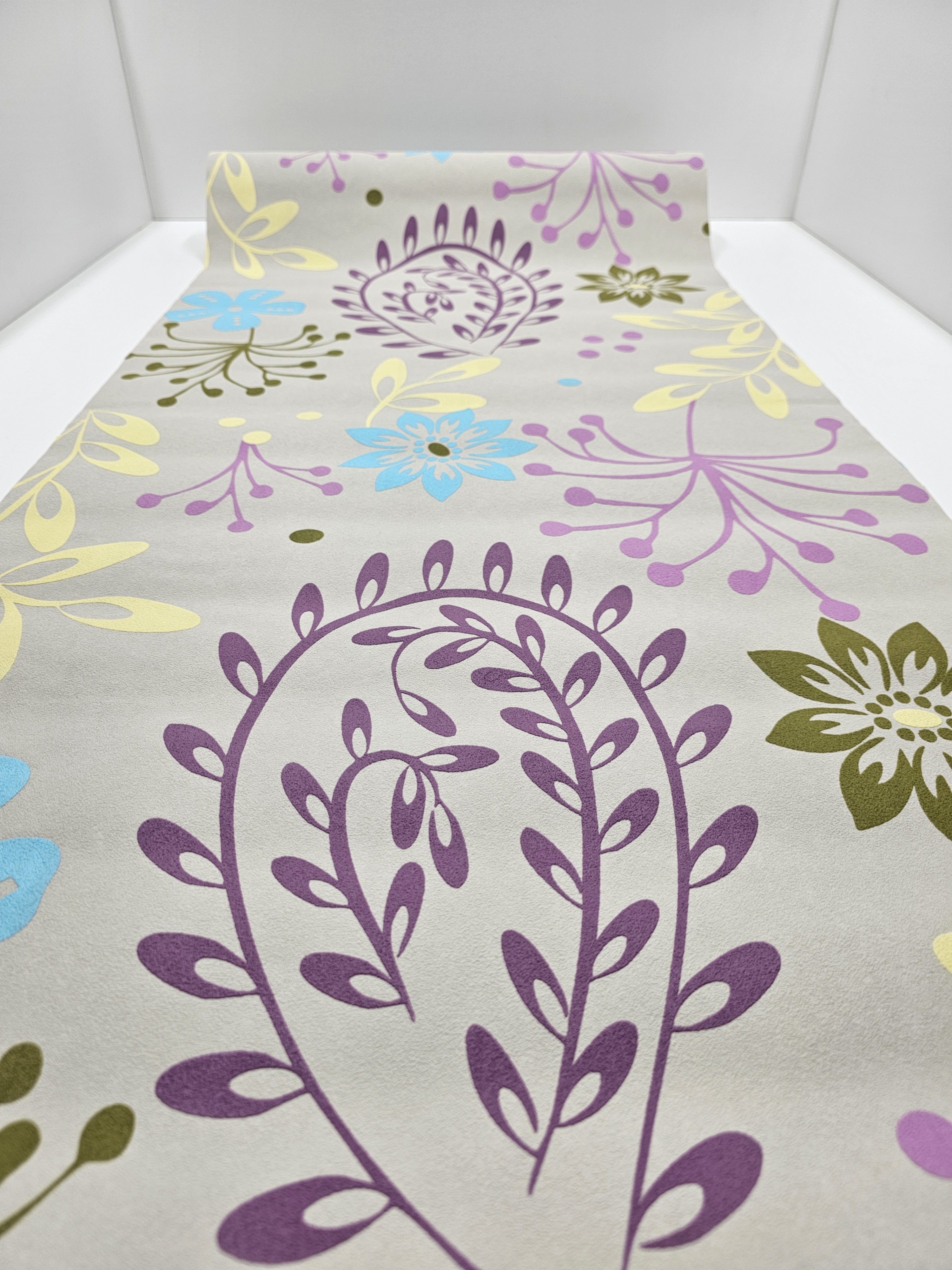 Kwiaty i liście: intensywne kolory – fiolet, błękit, oliwkowa zieleń, pastelowy żółty i róż