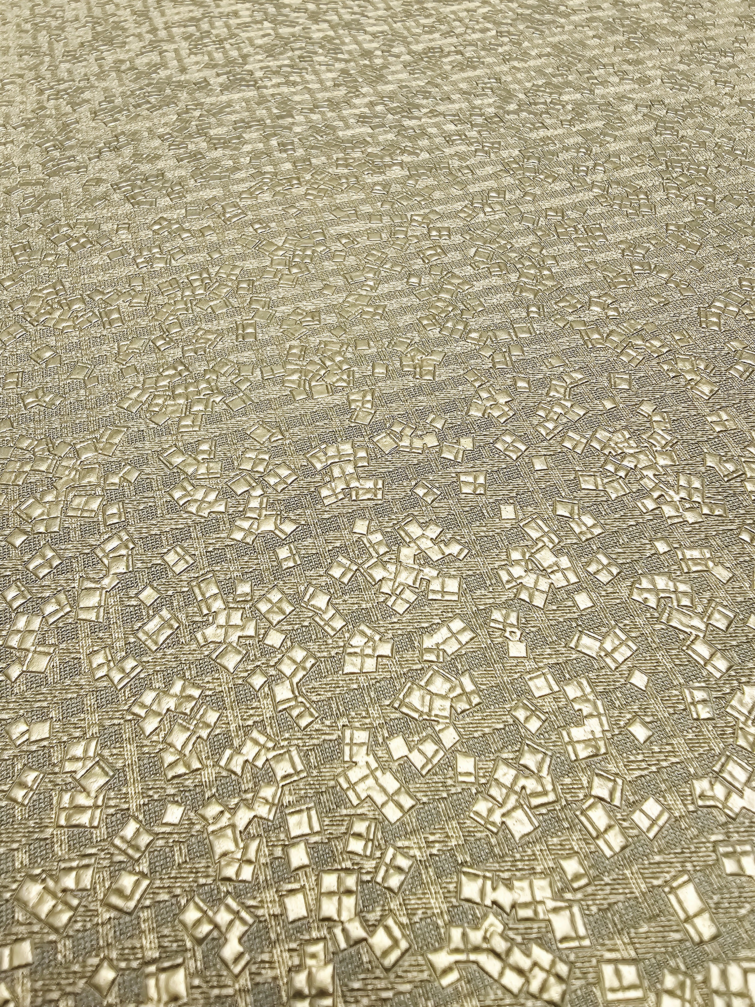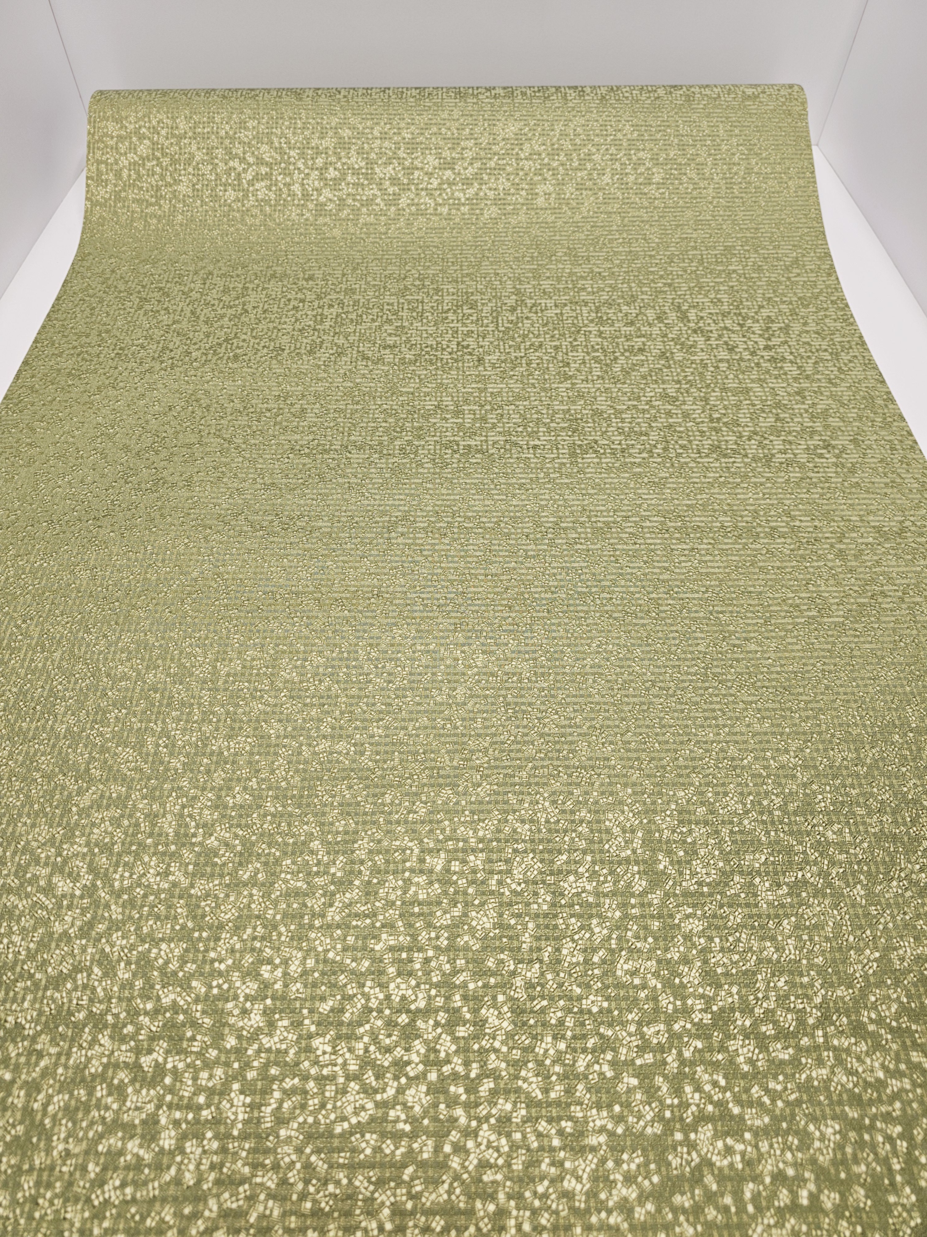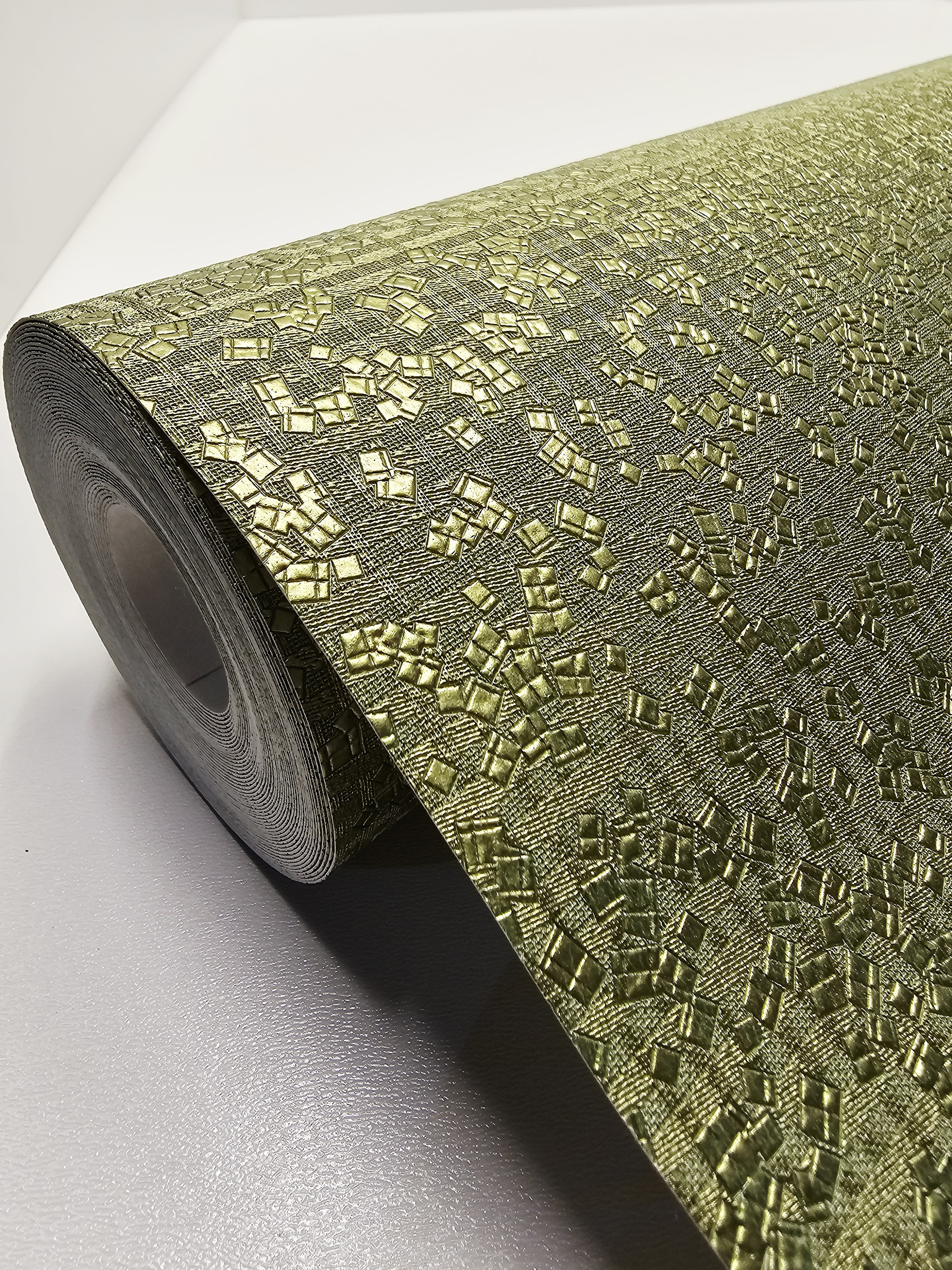 Ta wyjątkowa tapeta ścienna przyciąga wzrok nietuzinkowym wzorem i eleganckim, metalicznym wykończeniem. Głównym motywem są nieregularne geometryczne kształty przypominające mozaikę lub kostki, które układają się w artystyczny, dynamiczny układ na powierzchni. Dominującym kolorem jest oliwkowa zieleń z połyskiem w złotym tonie, który zmienia się w zależności od kąta padania światła, nadając całości luksusowego charakteru.