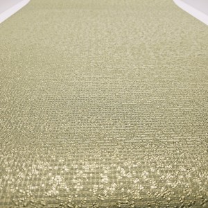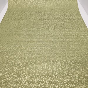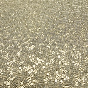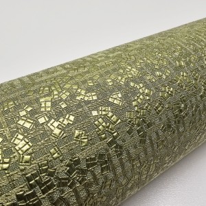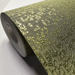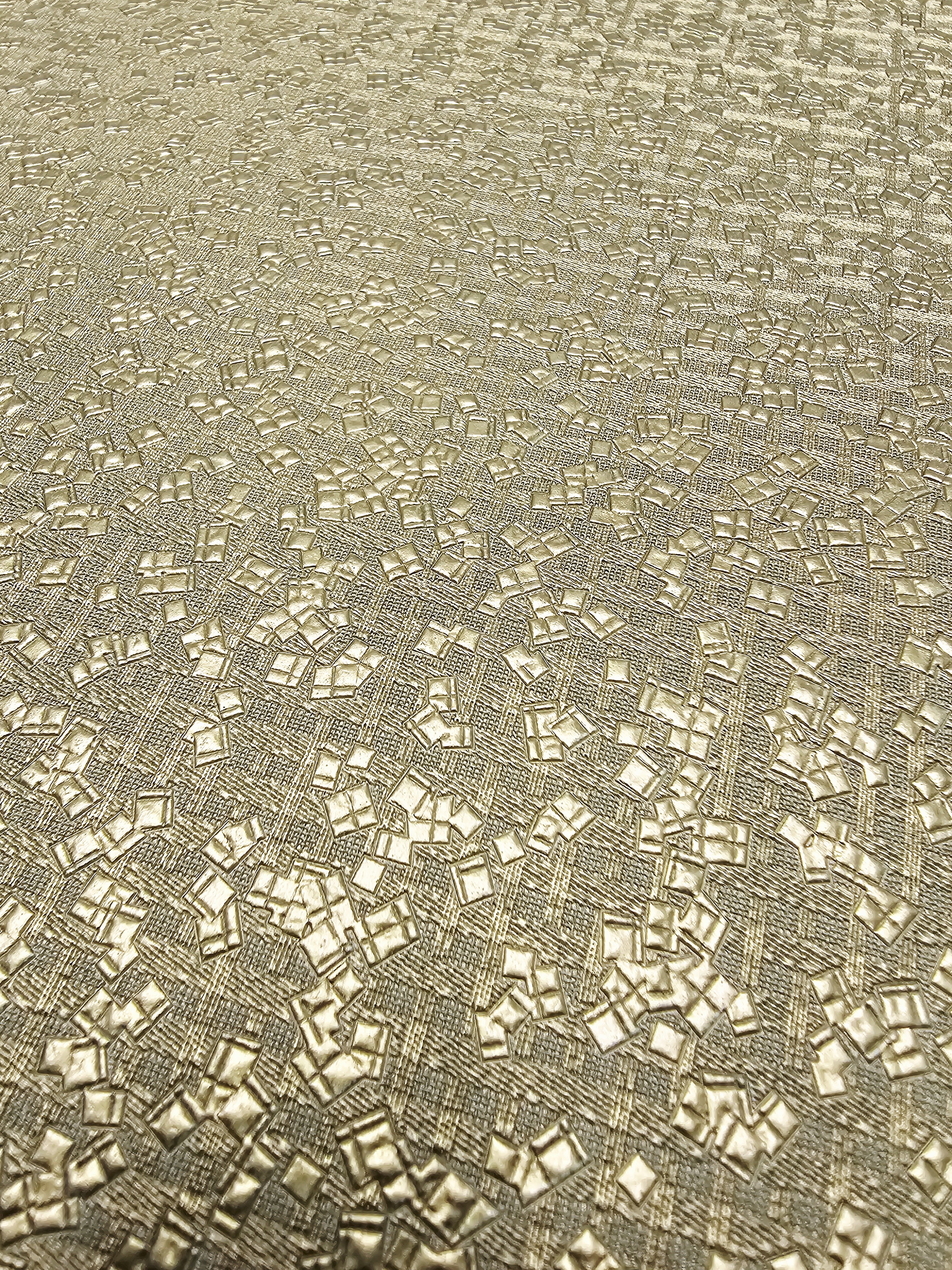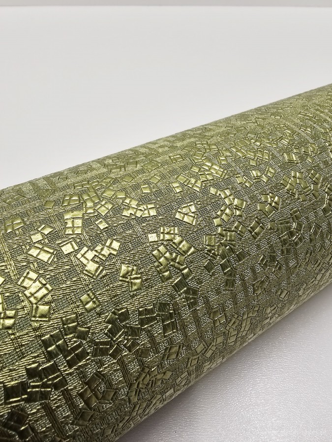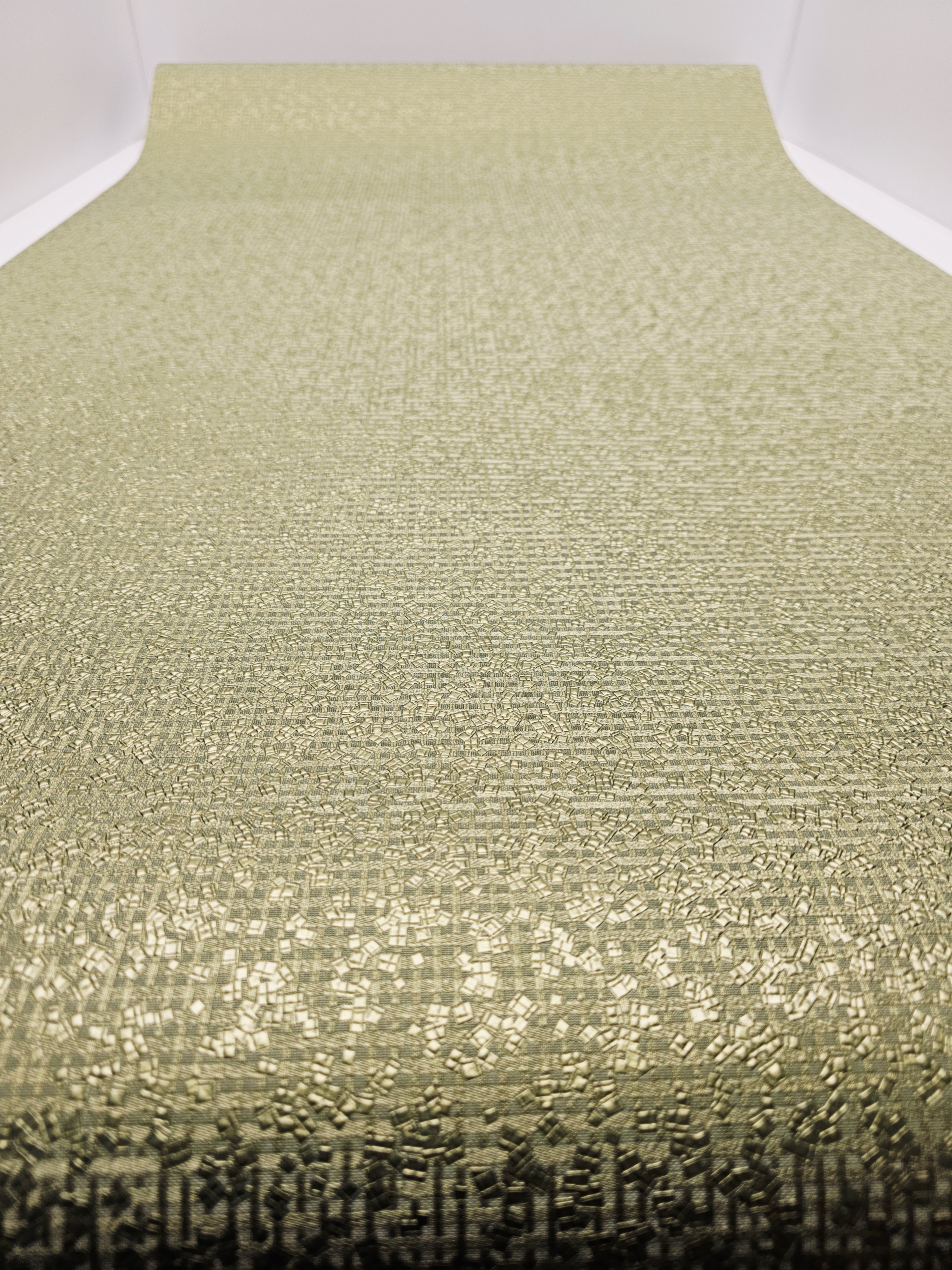 Ta wyjątkowa tapeta ścienna przyciąga wzrok nietuzinkowym wzorem i eleganckim, metalicznym wykończeniem. Głównym motywem są nieregularne geometryczne kształty przypominające mozaikę lub kostki, które układają się w artystyczny, dynamiczny układ na powierzchni. Dominującym kolorem jest oliwkowa zieleń z połyskiem w złotym tonie, który zmienia się w zależności od kąta padania światła, nadając całości luksusowego charakteru.