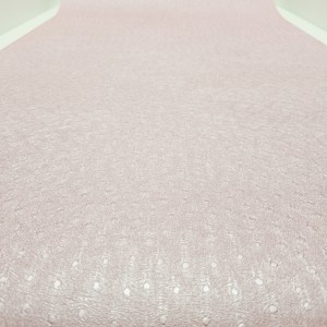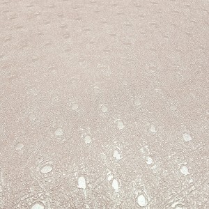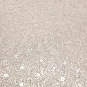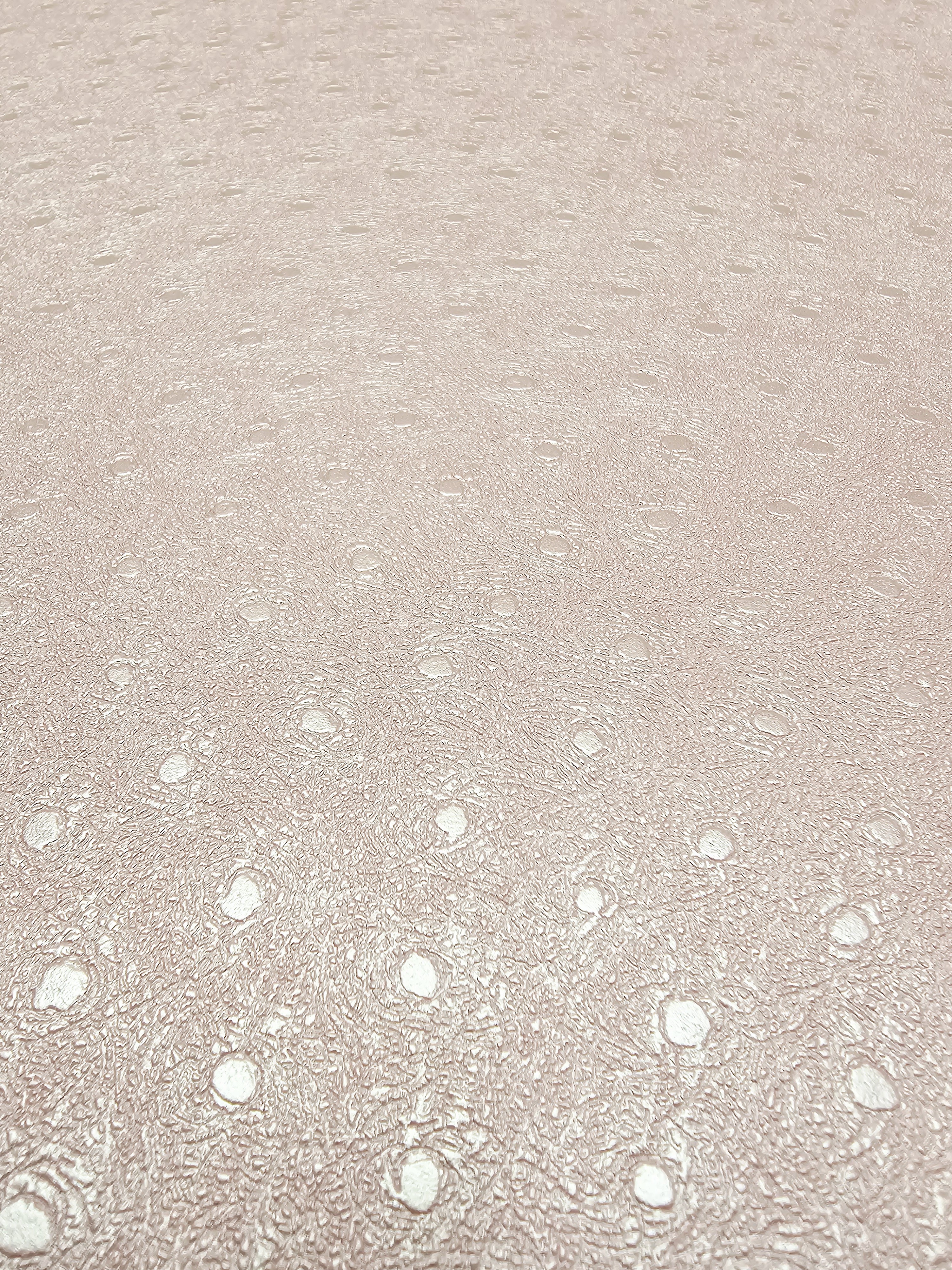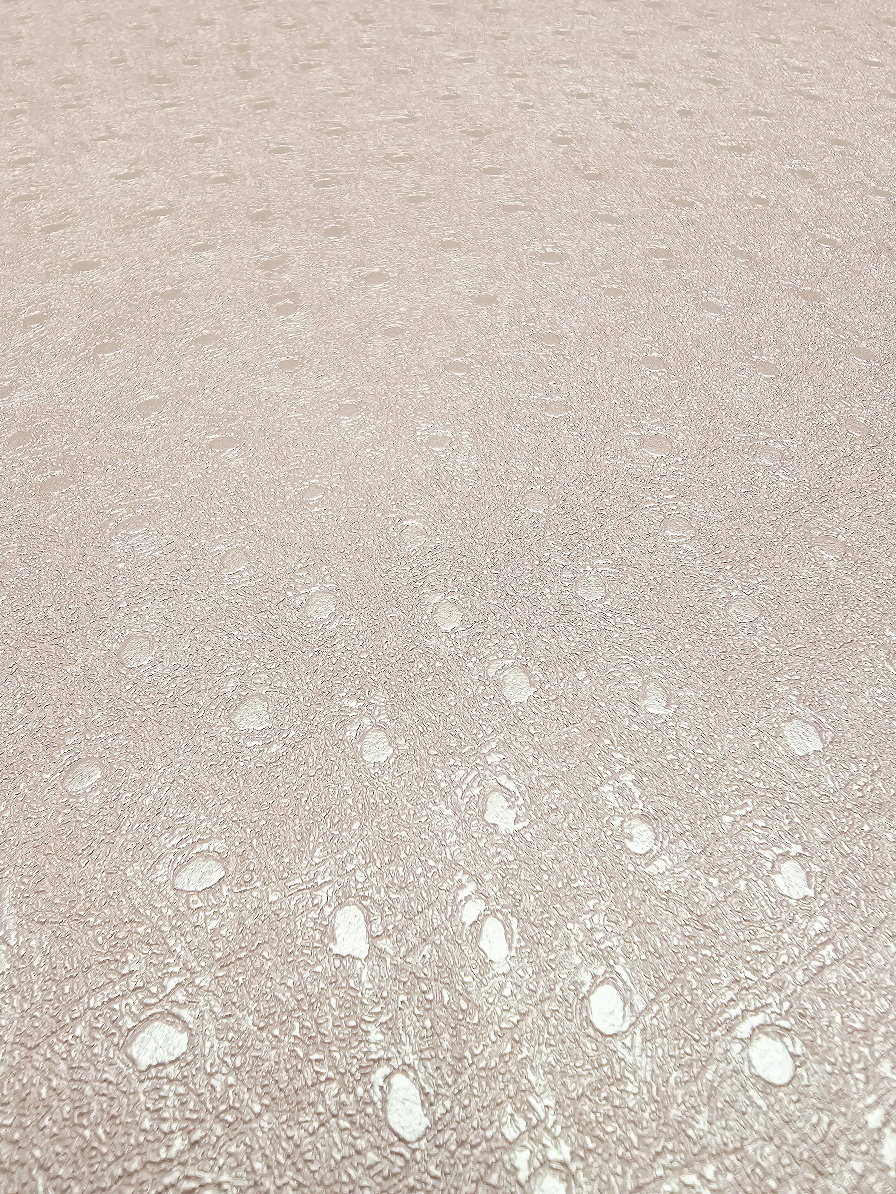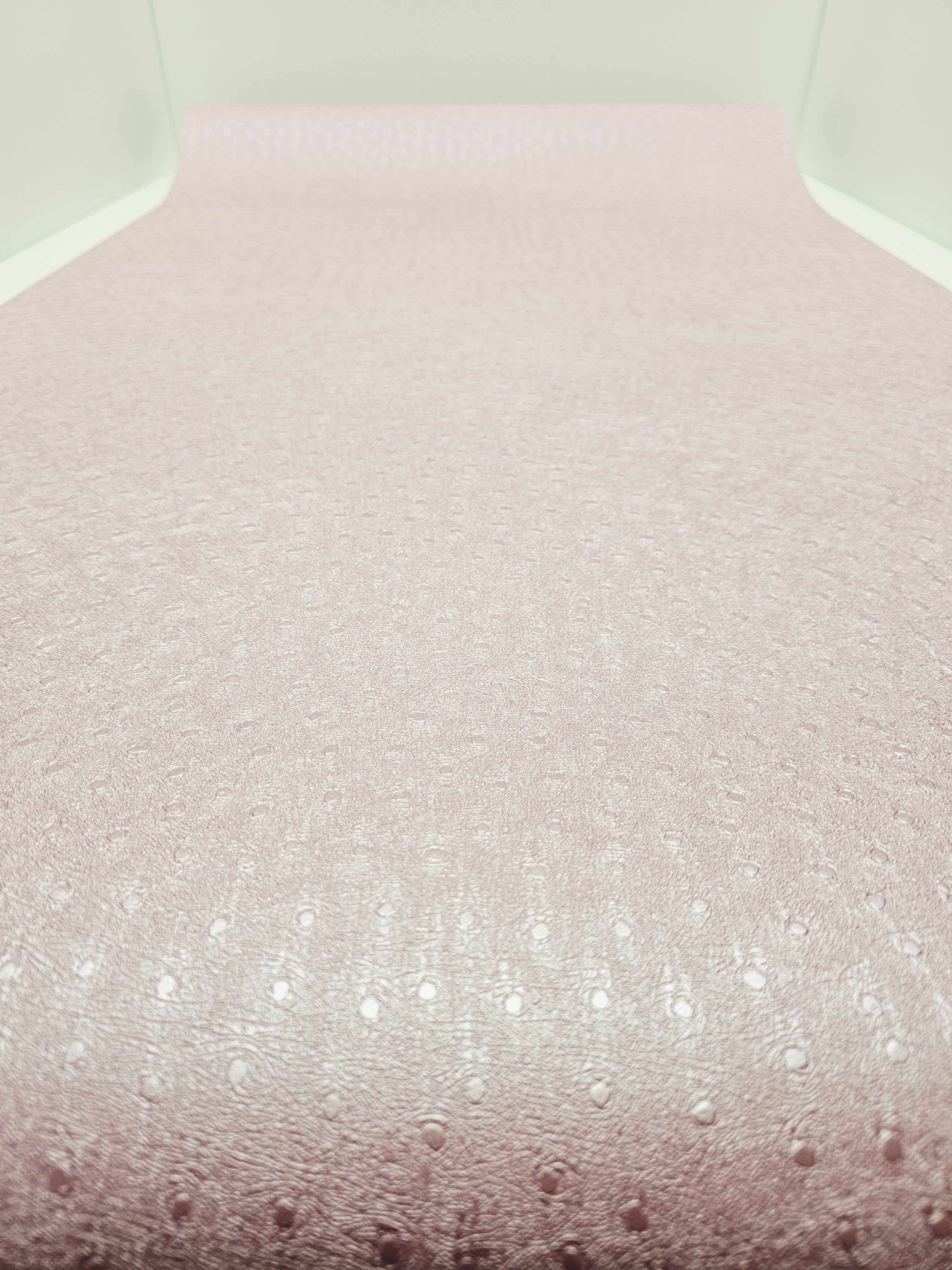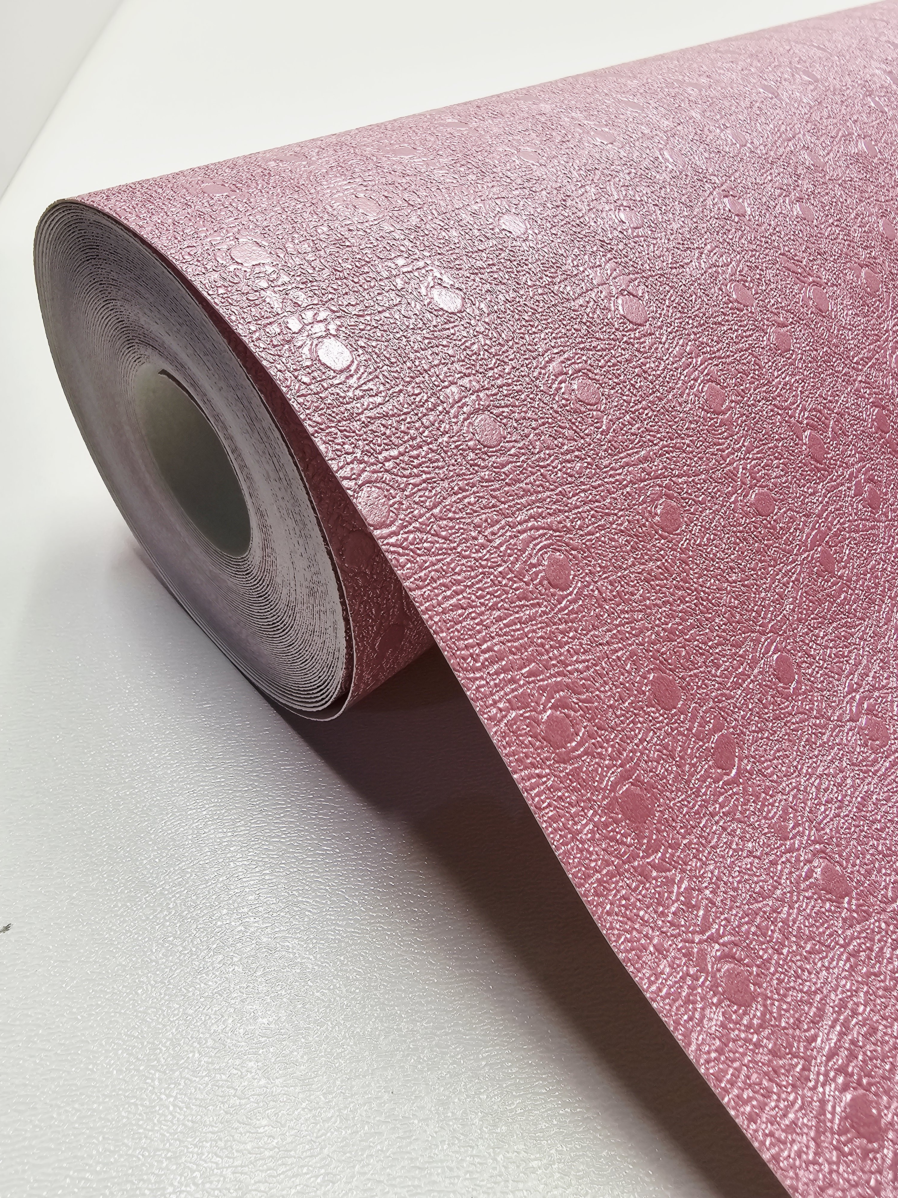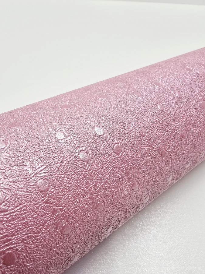 Ta tapeta przyciąga wzrok swoim żywym kolorem i oryginalną fakturą. Wyróżnia ją intensywny, malinowo-różowy odcień, który został wzbogacony o lekko połyskującą powierzchnię oraz tłoczony motyw drobnych groszków i subtelnych, nieregularnych żłobień. Tapeta ma strukturę przypominającą delikatnie pomarszczoną skórę z wtopionymi kółkami, co nadaje jej nowoczesnego i dynamicznego charakteru.