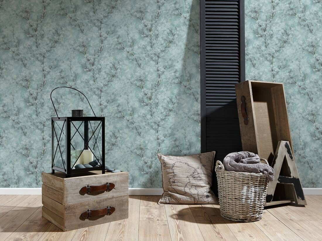 Turkusowe, lekko przecierane tło w połączeniu z delikatnymi, białymi kwiatami oraz subtelnymi gałęziami w odcieniach brązu i szarości. Kolorystyka tworzy efekt spokojnej, wiosennej scenerii.