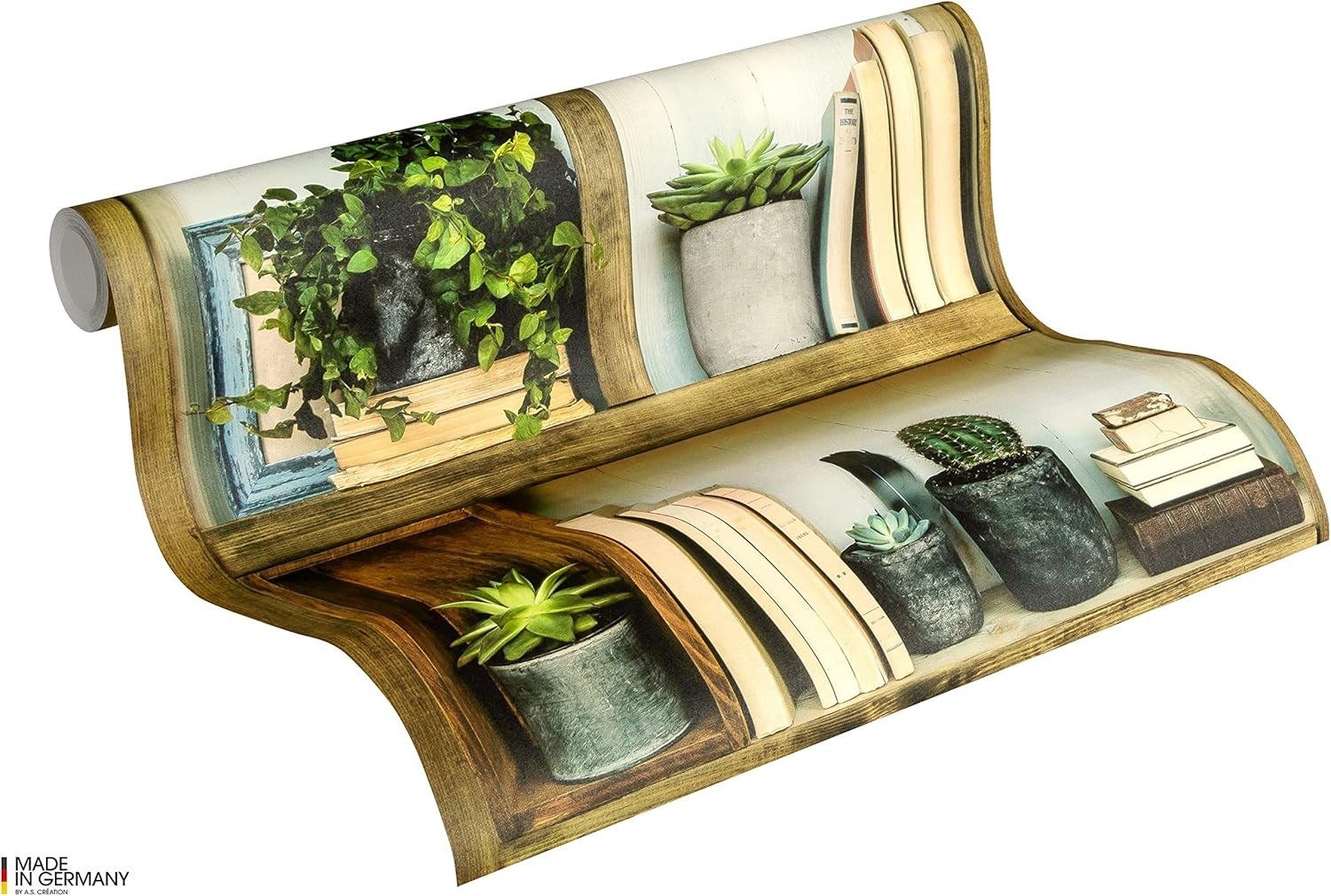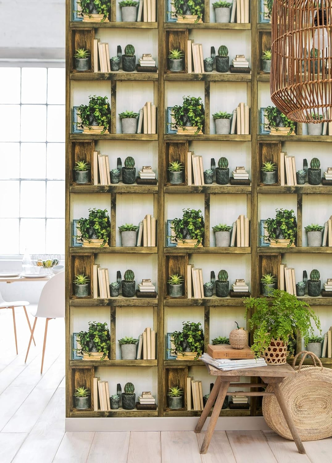 Realistyczna imitacja drewnianego regału wypełnionego książkami, kaktusami, sukulentami i dekoracyjnymi pudełkami. Fotorealistyczne detale tworzą iluzję głębi i prawdziwej półki na ścianie.